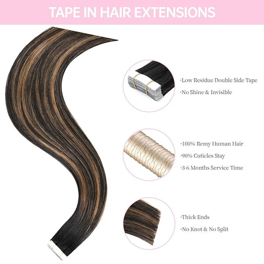 #1B/6/1B Tape in Hair Extensions Human Hair, 18inch 20Pcs Balayage Natural Black to Chestnut Brown Balayage Hair Extensions,Straight Silky 50g Remy Tape ins for Women Girls