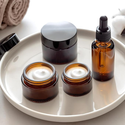 1 Oz Amber Round Glass Jars with Inner Liners and Black Lids(24PCS) Empty Cream Containers Refillable Cosmetic Vials for Cosmetics, Lotions, Ointment, Body Scrubs & Balms