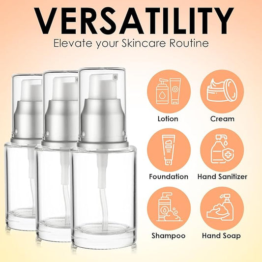 1 Oz 30ml Refillable Luxury Clear Glass Lotion Travel Pump Bottle with Silver Cap for Cosmetics, Lotion, Body Cream, Sanitizers, Cream, Foundation (Pack of 6)