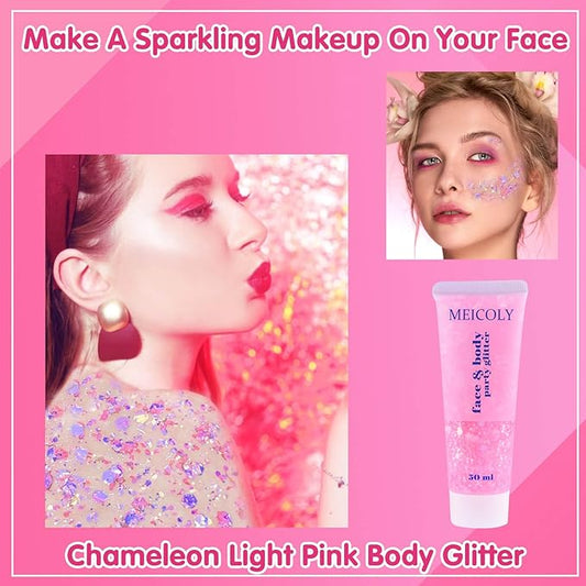 MEICOLY Chameleon Light Pink Body Glitter,Chunky Face Glitter for Halloween,Color Changing Mermaid Face Glitter Gel,Holographic Glitter Sequin for Face Body Hair,Festival Party Cheer Glitter Makeup