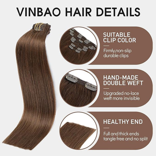 VINBAO Remy Clip in Human Hair Extensions Color 4 Medium Brown Thick End Double Drawn Seamless Real Human Hair 16 Inch 100g 6pcs Clip in Hair Extensions Straight Thick (#4, 16'')