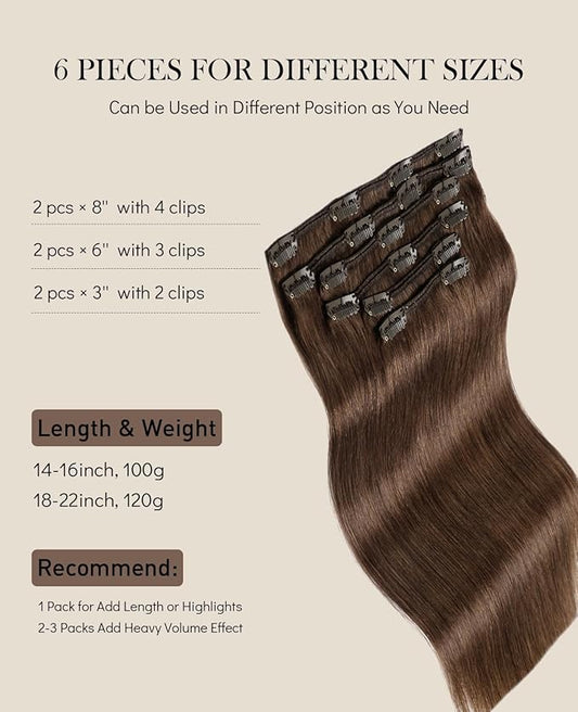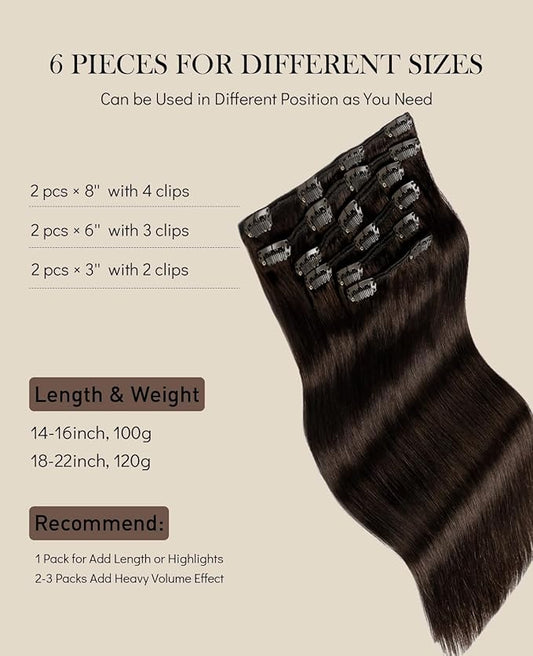 VINBAO Hair Extensions Clip in Human Hair 22 Inch 6 Pcs Straight Extensions Clip in Color 2 Dark Brown Hair Clip Ins 120g Human Hair Extensions Double Weft For Women(#2, 22)