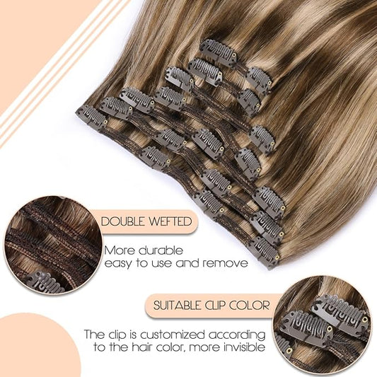 VINBAO Thick 160g Clip In Hair Extensions Real Human Hair Color 4 Chocolate Brown to 27 Dark Blonde Balayage Remy Hair 22Inch 7PCS Straight Thick End Double Weft (#HC4P27,22'')