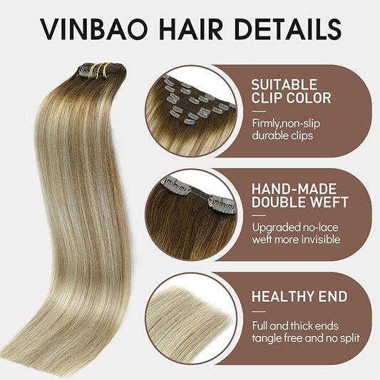 VINBAO Hair Extensions Clip in Human Hair Balayage Golden Brown to Dirty Blonde 140g 16inch 7 Pcs Straight Human Hair Clip in Extensions (#HC101616,16'')