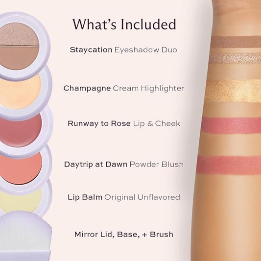Subtl Staks 5-in-1 Travel Makeup Kit by Subtl Beauty - Eyeshadow Duo, Powder Blush, Cream Highlighter, Lip and Cheek, Lip Balm - Free Travel Mirror and Brush - Stackable Makeup for Travel