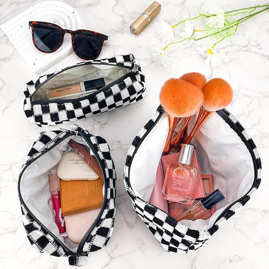 ZLFSRQ 3Pcs Checkered Makeup Bag for Women Large Small Checkered Cosmetic Bag Set Aesthetic Preppy Pencil Case Cute Pencil Pouch Black Makeup Pouch for Purse Travel Toiletry Bags Zipper Skincare Bags