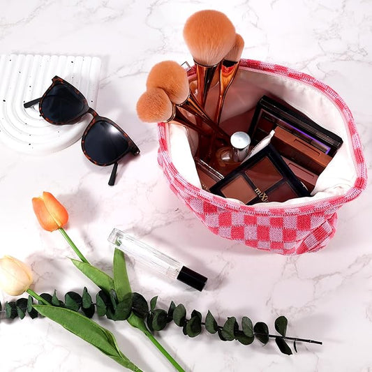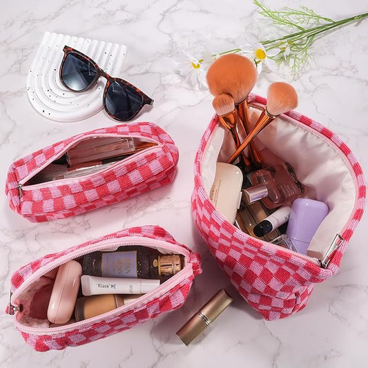 ZLFSRQ 3Pcs Makeup Bag Checkered Cosmetic Bag Set Travel Toiletry Bags for Purse Large Small Makeup Pouch for Women Cute Preppy Pencil Pouch Case Pink Zipper Skincare Bags