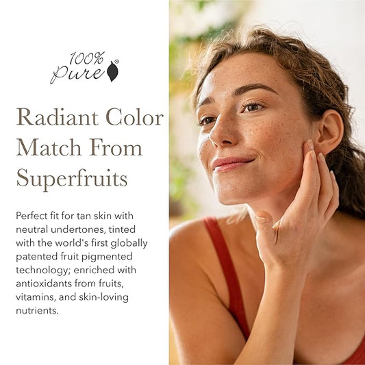 100% PURE Tinted Moisturizer Anti-Aging Face Makeup - Fruit Pigmented Cocoa Light to Medium Coverage & Dewy Glow - Lightweight Foundation Deep Skin w/Neutral Undertone - Vegan - 1 Fl Oz