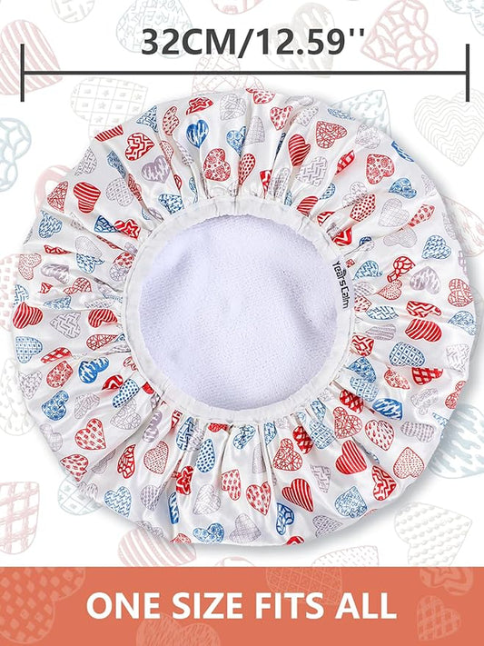 Years calm Terry Lined Shower Cap, Triple Layer Heart Motifs,Waterproof Reusable Elastic,Hair Shower Cap for Women,Terry Cloth Shower Caps for Spa,Clean,Trave (White, One Size)
