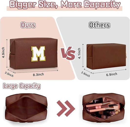 TOPEAST Personalized Makeup Bag, Chenille Letter Pouch Cosmetic Bag w Zipper, PU Leather Waterproof Toiletry Bag, Bridal Shower Gifts for Bridesmaids, Cute Stuff for Girls (Brown P)