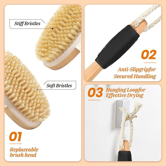 Wood Body Brush Set,19.3’’ Long Handle Bath Body Back Scrubber Soft & Stiff Bristles Detachable 2 Brush Heads Gentle Exfoliator Remove for Wet & Dry Use