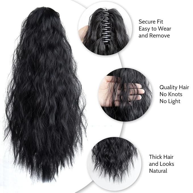 Wavy Ponytail Extension Claw Clip for Black Women 18" Synthetic Curly Clips in Pony Tails Hair Extensions Wigs Fluffy Heat Resistant Hairpieces for Wedding Party Daily Use 6 Oz Natural Black