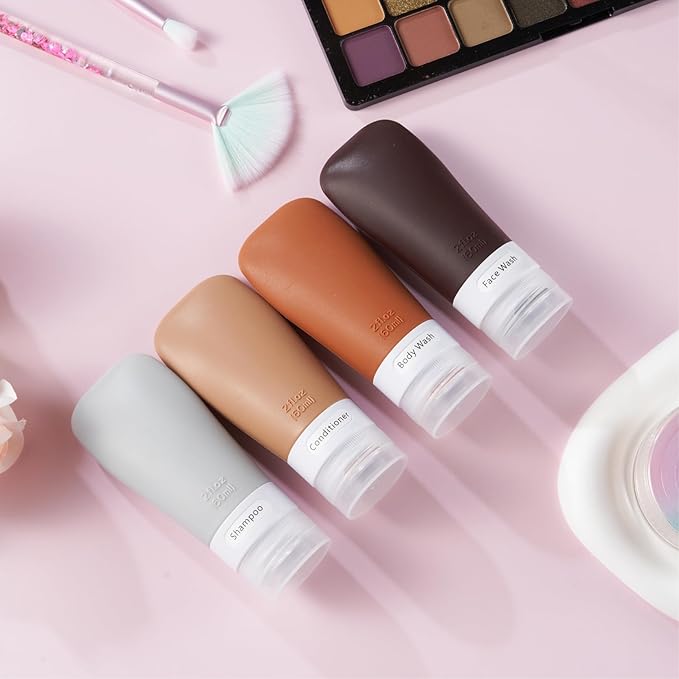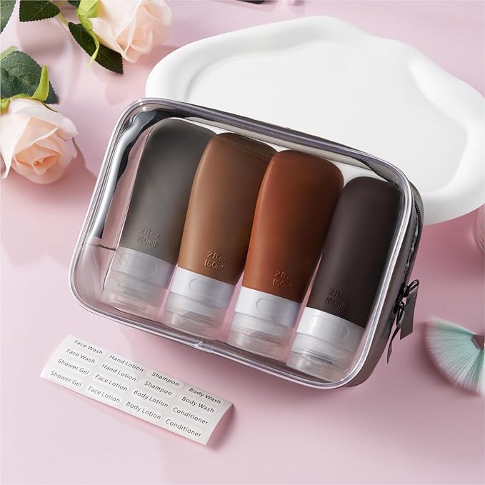 - TSA Carry on Approved: 4 pack 2 ounce silicone travel bottles, perfect for shampoo, conditioner, body wash, lotion, hand sanitizer, shower gel. Packed with a high quality zippered clear toiletry bag, saving space, easy to carry with for travels or gym workout.