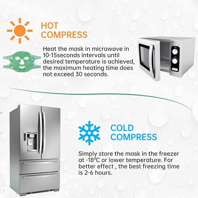 - 【CONVENIENT TO USE】simply store the mask in the freezer at -18℃ or lower temperature for at least 2 hours.Heat the mask in microwave in 10-15seconds intervals until desired temperature is achieved,the maximum heating time does not exceed 30 seconds.