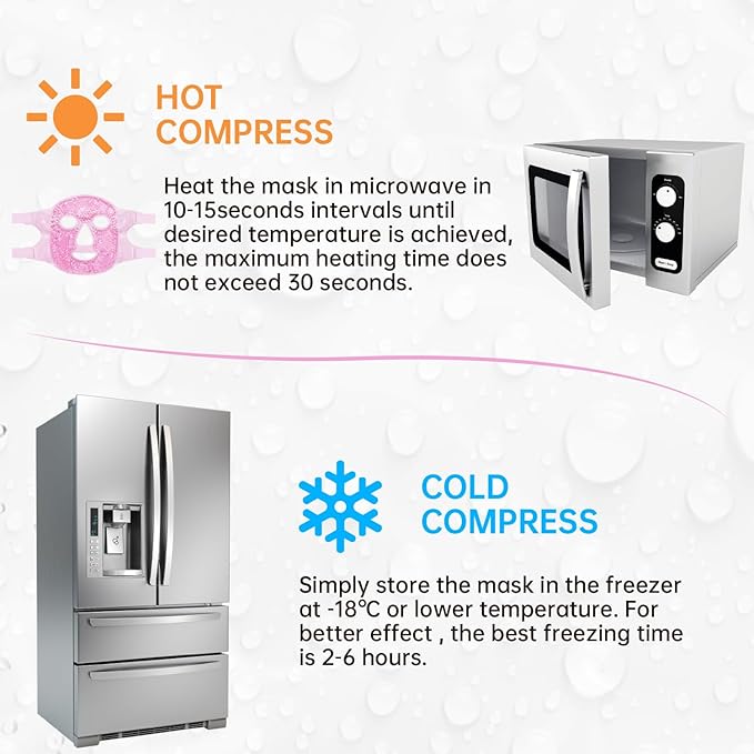 - 【CONVENIENT TO USE】simply store the mask in the freezer at -18℃ or lower temperature for at least 2 hours.Heat the mask in microwave in 10-15seconds intervals until desired temperature is achieved,the maximum heating time does not exceed 30 seconds.
