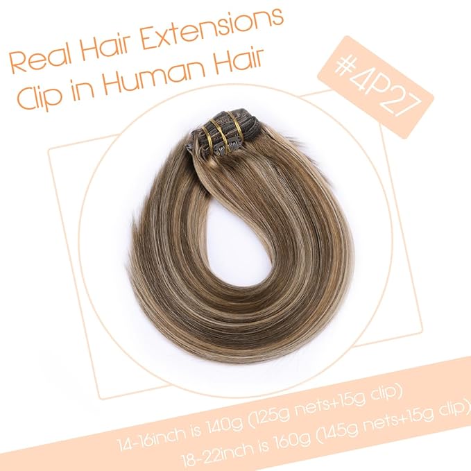 - Human Hair Extensions Specification: 7 pieces per pack, 14,16 in at 140 g.18,20,22 in at 160 g. Usually 1 pack is enough for your full head, because they are very thick clip in hair extensions. Can be used in different position, cater to your need for length and volume
