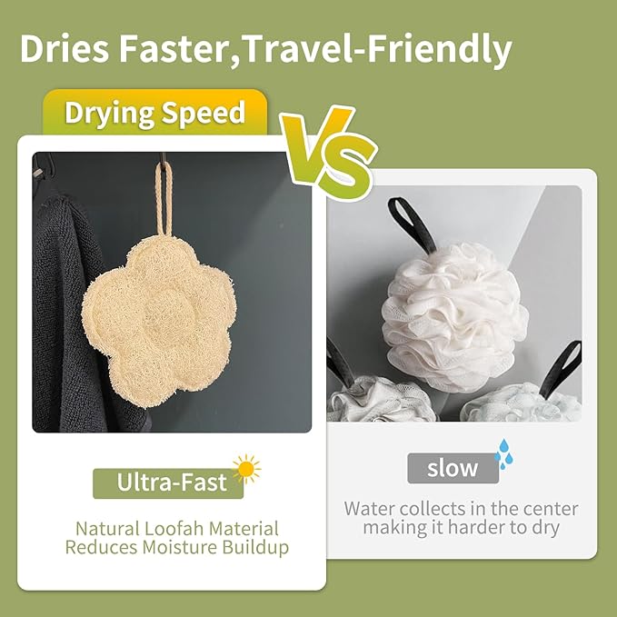 - 🌿 Dries quickly:100% pure loofah,luffa dries quickly after each use, making it easy to pack away into your luggage for the next leg of your journey.Your bath sponge stays fresh and ready for use wherever you go.