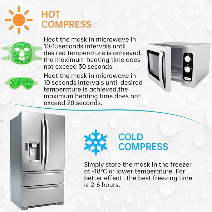 - 【CONVENIENT TO USE】The ice eye mask and ice face mask can be used to your eyes or face interchangeably. Simply store the ice mask in the freezer at -18℃ or lower temperature for at least 2 hours. Heat the gel mask in microwave in 10-15seconds intervals until desired temperature is achieved,the maximum heating time of the gel face mask does not exceed 30 seconds and the maximum heating time of the gel eye mask does not exceed 20 seconds.