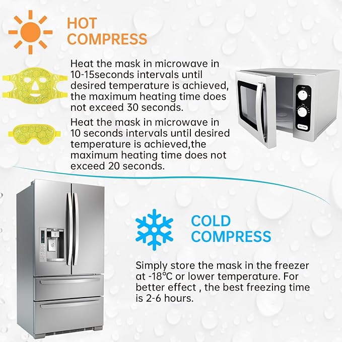 - 【CONVENIENT TO USE】The ice eye mask and ice face mask can be used to your eyes or face interchangeably. Simply store the ice mask in the freezer at -18℃ or lower temperature for at least 2 hours. Heat the gel mask in microwave in 10-15seconds intervals until desired temperature is achieved,the maximum heating time of the gel face mask does not exceed 30 seconds and the maximum heating time of the gel eye mask does not exceed 20 seconds.