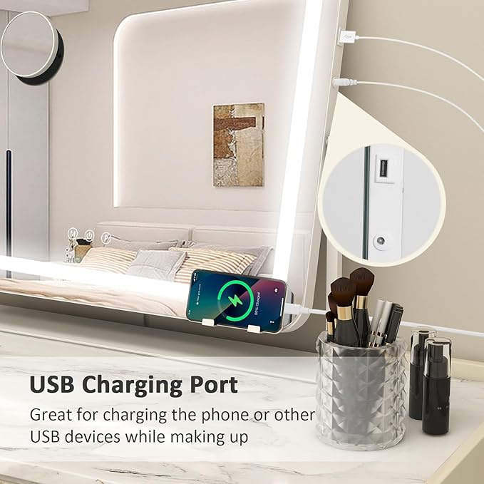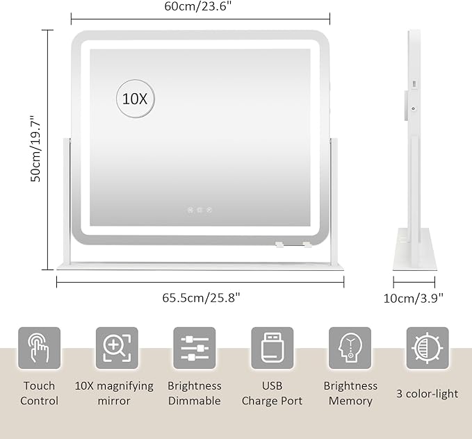 YOURLITE Vanity Mirror with Lights, 24"x 20" LED Makeup Mirror, Smart Touch Dimmable 3 Colors Modes & Adjustable Brightness, 10x Magnification with USB Charging Port, 360° Rotation for Bedroom